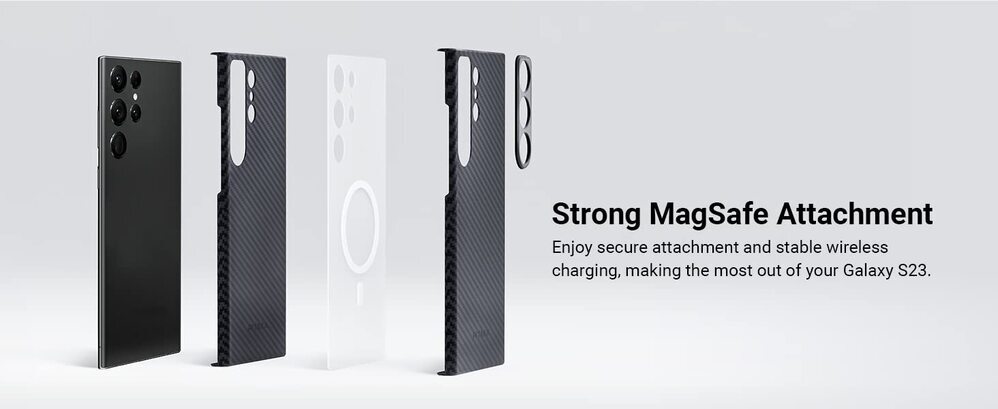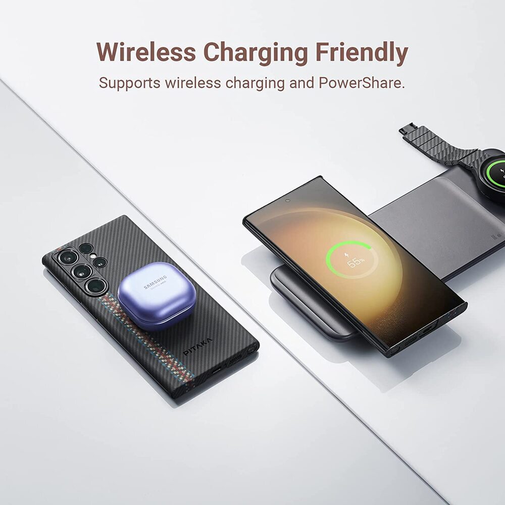 - With built-in metal strips, the case for Galaxy S23 Ultra attaches to PITAKA MagSafe wireless charger for a seamless charging experience. Also, it supports wireless charging and PowerShare. * Due to the Wireless Power Consortium of Samsung Galaxy itself, the case is NOT Compatible with Apple MagSafe Chargers.