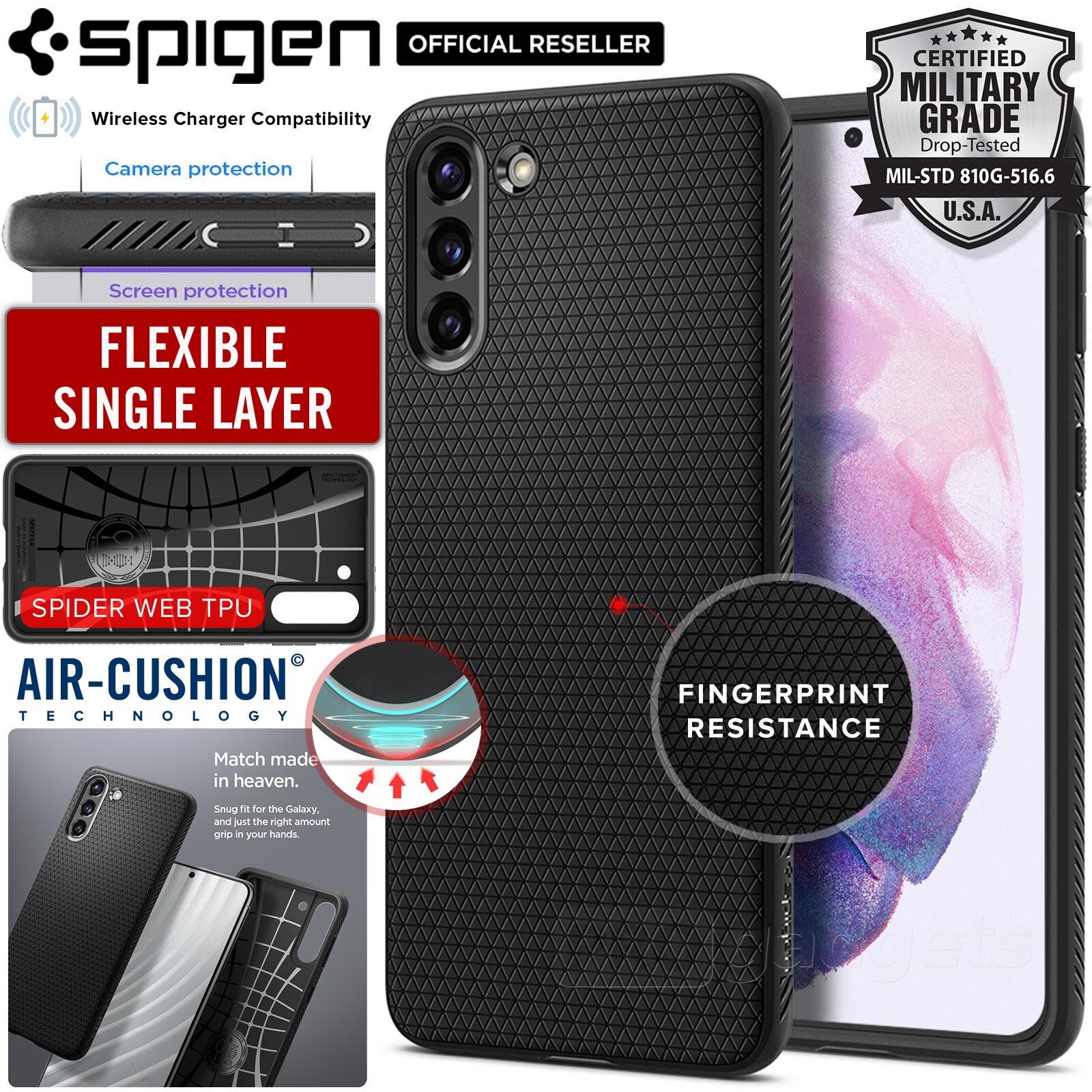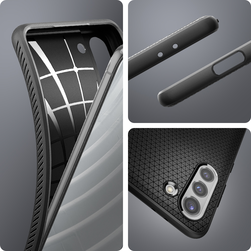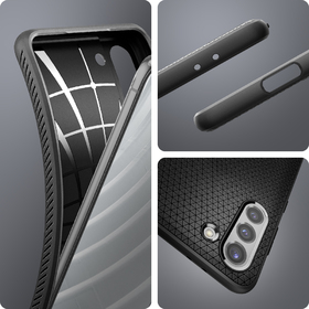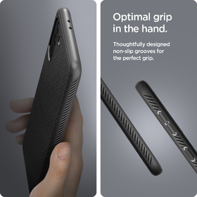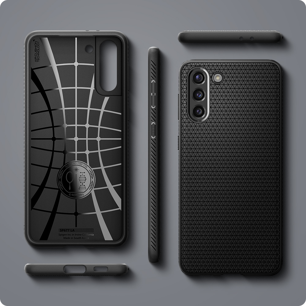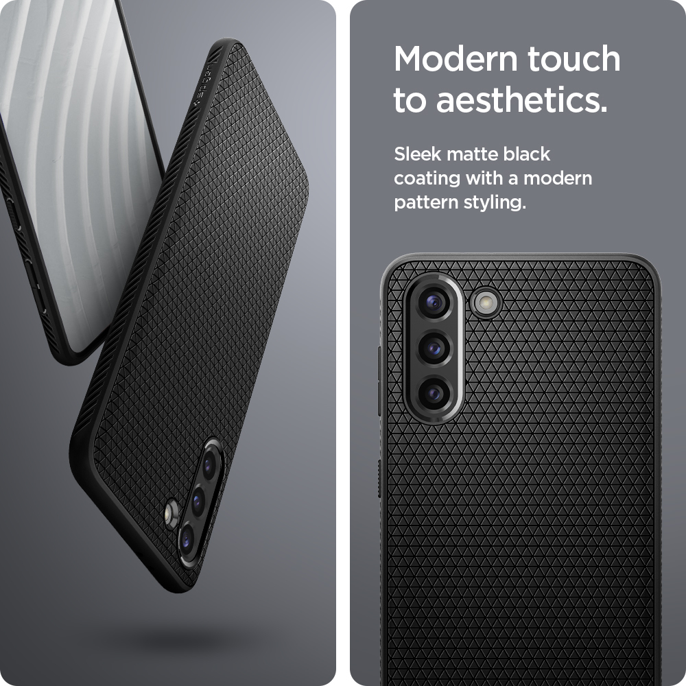 The Liquid Air® for the Galaxy S21 a shock-absorption in a sleek frame. Its slim but flexible layer is packed with Air Cushion Technology® and drop defense. Its geometric pattern on a matte black finish adds a modern touch with added cleanliness and fingerprint-resistant. Encase the Galaxy S21 in a polished and protective Liquid Air®.