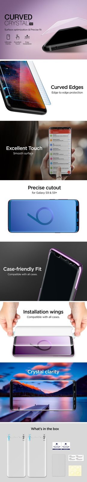 The Curved Crystal HD Screen Protector for the Galaxy S9 Plus is intricately designed with precise curves to mimic the device’s screen for full coverage. Its outstanding clarity provides the clearest visuals on screen and an easy to maneuver touchscreen experience. We highly recommend this screen protector to keep your phone clean and guarded.
