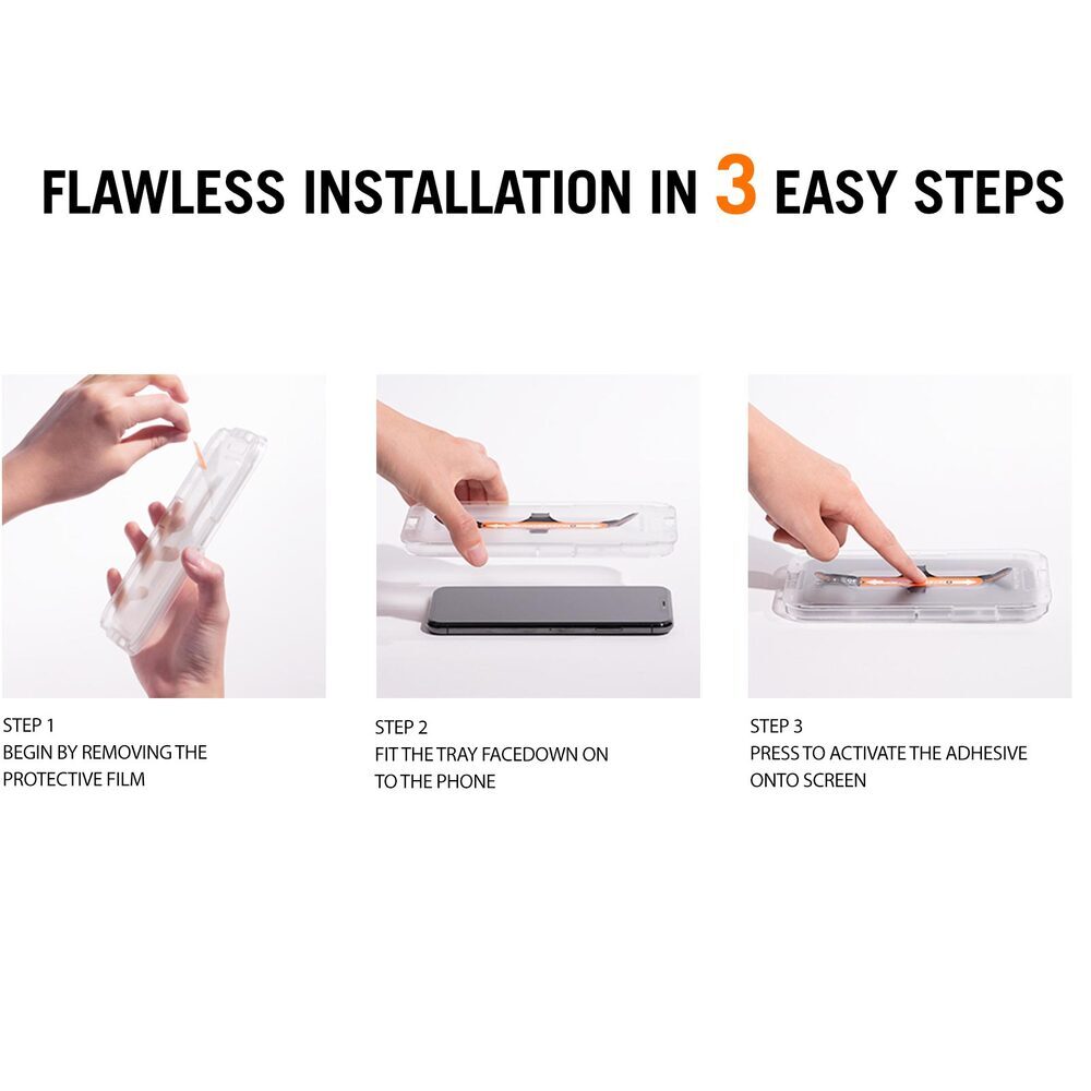 Less time, guaranteed alignment, and the easiest install ever. Spigen’s newest Glas.tR EZ Fit comes with an innovative tray designed to eliminate time wasted chasing that perfect alignment of your screen protector. Simply place the tray over the phone, press the center to install and watch the glass adhere in place. Shield the screen with 9H hardness Glas.tR EZ Fit with the latest and easiest technology.