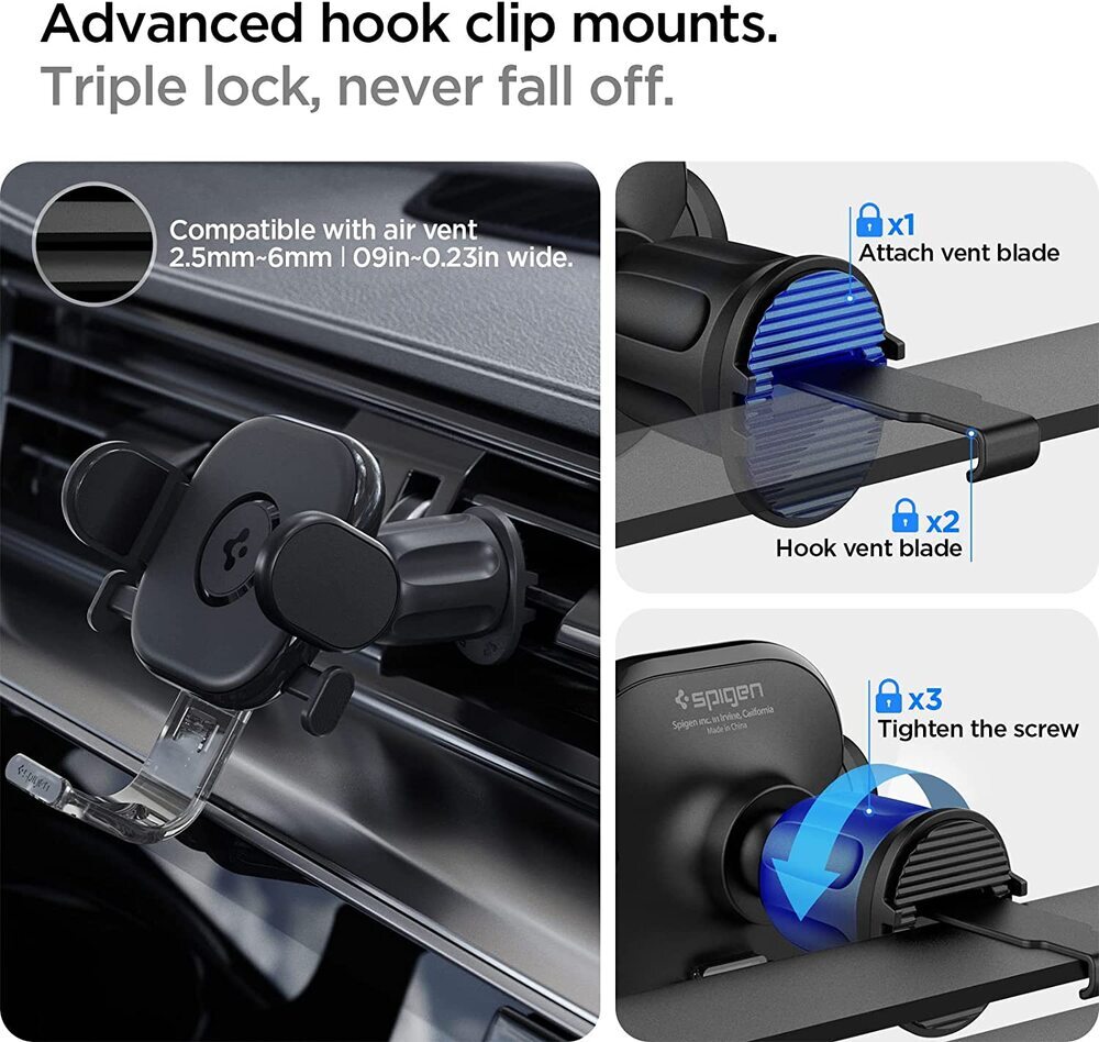 • Advanced metal hook clip secures onto the air vent with a twisting motion.