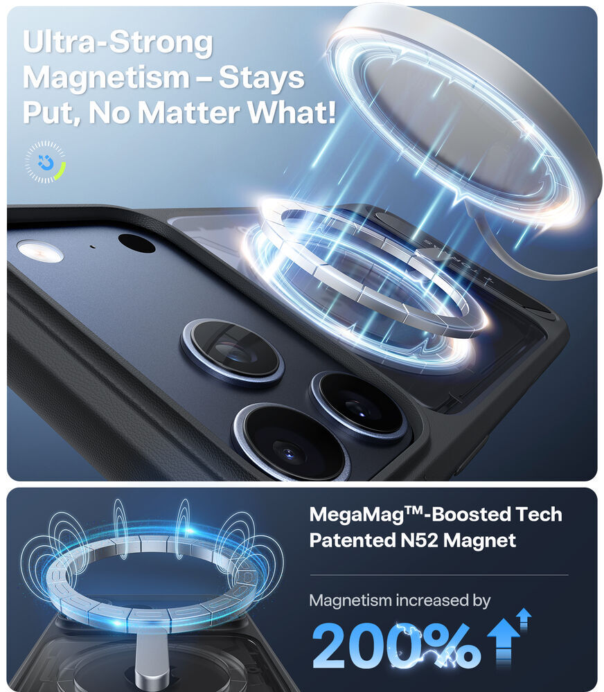 - Boasts 60% stronger magnetic attraction with 18N force, ensuring stable attachment to magnetic accessories and efficient wireless charging.