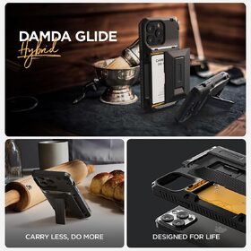 VRS DESIGN Damda Glide Hybrid for iPhone 15 Pro, Functional Sturdy Case are sturdy and Smooth Semi-automatic sliding technology, convenient compartment for up to 3-4 cards and some cash. The adjustable kickstand is ergonomically designed to offer multiple viewing positions. Smart design for better quality, excellent button touch cover design from soft TPU offers ultimate rugged protection with quality PC fmaterial from heavy falls and shocks.
